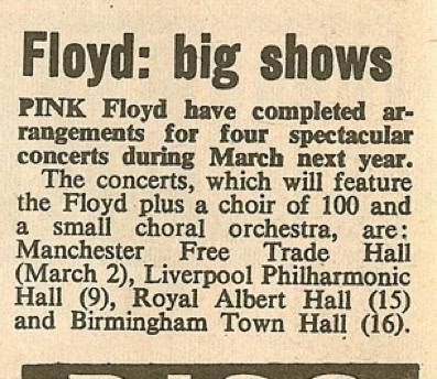 «We've also got quite a bit of work lined-up abroad, but that doesn't mean we're going to forsake England. It's just a pity that some of the ball-rooms are so bad. Especially the stages. But we've got an idea which could put an end to all that. There could well be a Pink Floyd circus soon. We've got this massive Big Top capable of holding 6,000 people, which we intend to take around the country. You know, find a field outside a town, set-up and play. Just like a proper circus. « We've got this huge cinemascope screen for all the flashing light bit, and we'll make it into a complete show. There'll be us of course, plus a few other acts. It's something that's never been done before, but we think it'll work « »