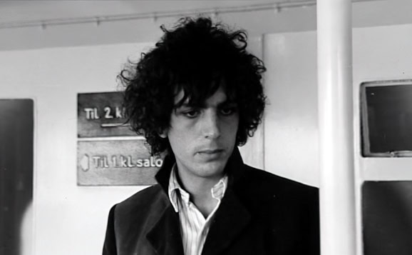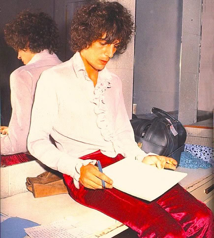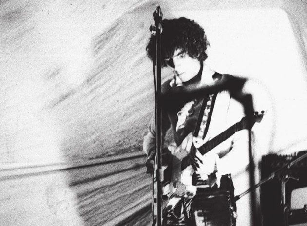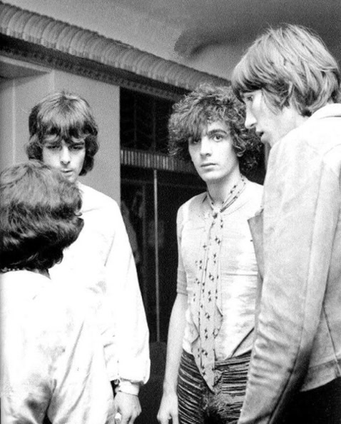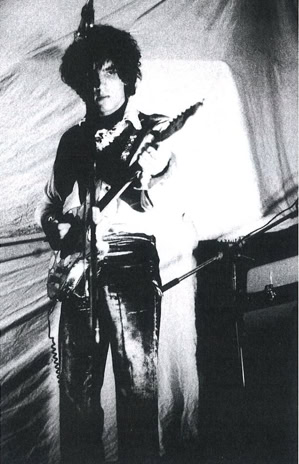 Syd was sat on the floor, right out front. He looked beautiful in everysense, the Dylan curls (the look that year!), the satin and the scarf. ButTerry shouted in my ear,"Syd's guitar isn't plugged in!" And sure enough.
