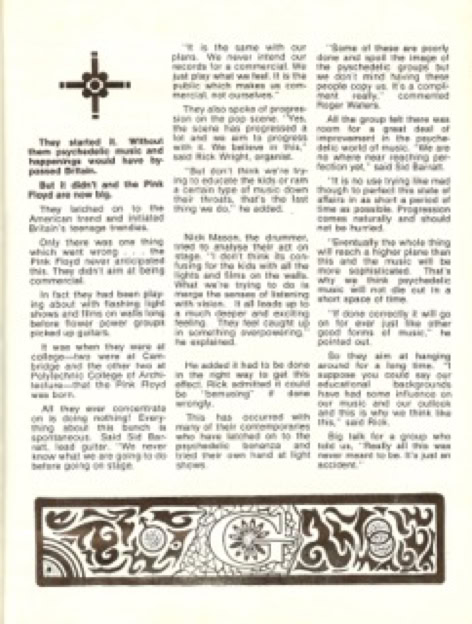 «We've also got quite a bit of work lined-up abroad, but that doesn't mean we're going to forsake England. It's just a pity that some of the ball-rooms are so bad. Especially the stages. But we've got an idea which could put an end to all that. There could well be a Pink Floyd circus soon. We've got this massive Big Top capable of holding 6,000 people, which we intend to take around the country. You know, find a field outside a town, set-up and play. Just like a proper circus. "We've got this huge cinemascope screen for all the flashing light bit, and we'll make it into a complete show. There'll be us of course, plus a few other acts. It's something that's never been done before, but we think it'll work»