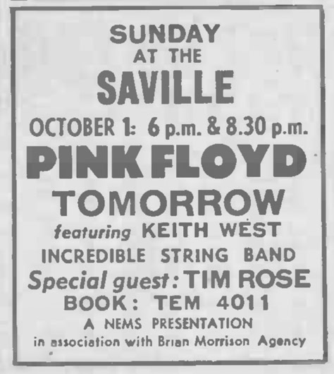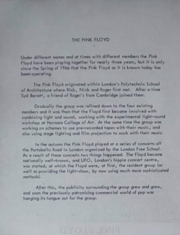 «The Floyd] were a strange act to be appearing on that bill: they didn't fit in. Their appearance was very different to everyone else that night, they dressed very 'flower power' and also the light show was disappointing. The press they'd been getting in Melody Maker and Disc really featured on this light show more than the music, but because there were so many people on the bill, they didn't have their own light show, so all it consisted of was the fixed spotlights in the theatre while two girls, who seemed to be part of their team, flashed coloured papers over them. That was the light show»