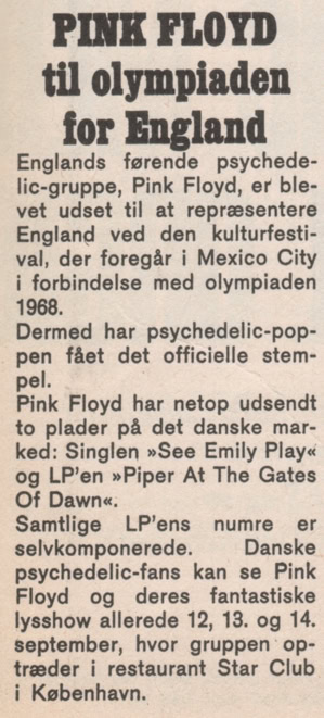 «I dag vil mange at poppens nye grupper ikke nøje med at spille. De vil give tilskueren en total-oplevelse gennem billed- og lydeffekter. Pink Floyd, som 1 aftes udøste sine indtryk over Star Clubs publikum, er nået meget langt i dette forsøg. Musikken havde en sjov stratosfaerisk karakter, og dette blev forstærket med lydindtryk. Dejligt var det, at det alligevel swingede, men
