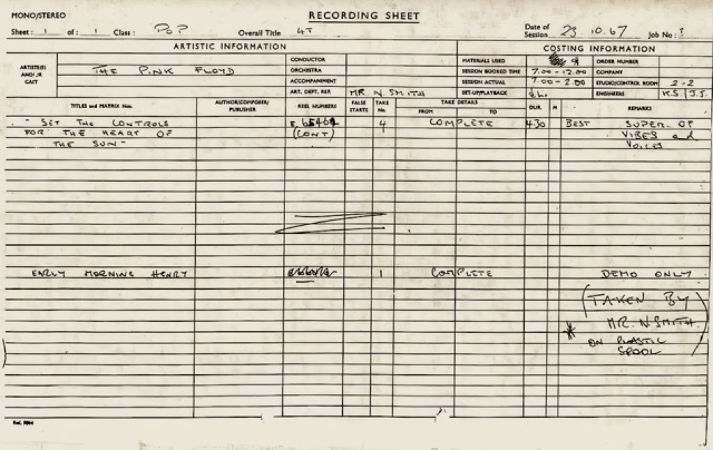STUDIO RECORDING | 7 to 8 August 1967 Pink Floyd is recording new songs for the follow-up of their first LP with Scream thy last scream and Set the Controls for the heart of the sun.