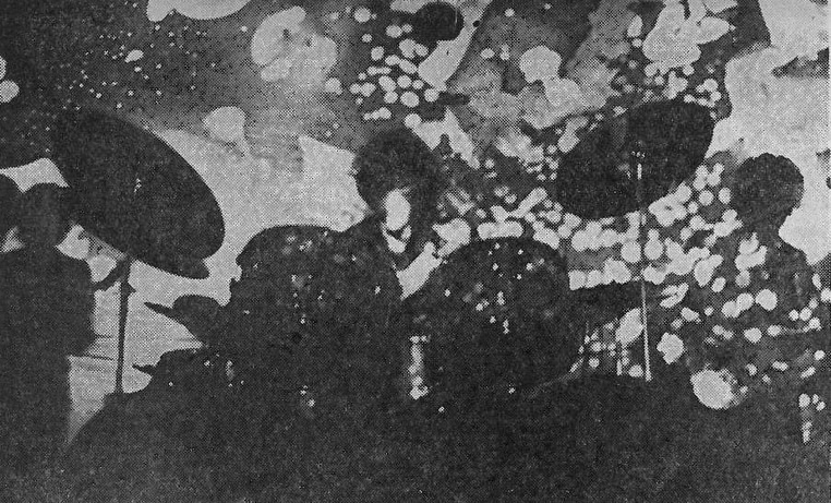 The full catastrophe! Yet the music was still that unique sound that wehad witnessed first hand the previous July. Lots of Rick Wright organ andWater's bass, and strangely enough, guitar. We later heard that David O'List(The Nice) would often fill-in Syd's parts from the wings, and maybe thiswas what we could hear. At this point, it would be important to underlinethe 'ritual' effect of The Pink Floyd on stage - much the same as a Deadconcert.