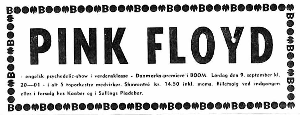 «The boom pop temple in Frederiksgade - was filled to the brink on Saturday night. More than 1,200 young Aarhusians attended the English psychedelic orchestra Pink Floyd's first concert on their Danish tour. This unofficial Festuge event clearly underlined what a large party of Aarhus youth are interested in. There have never been so many for a concert in Boom, and there were almost too many closed in.(...) However, the highlight of the concert was Pink Floyd in the first true psychedelic concert in Jutland. Their lighting effects were of amazing effect, color images pulsed on a white background, and in keeping with the monotone rhythms