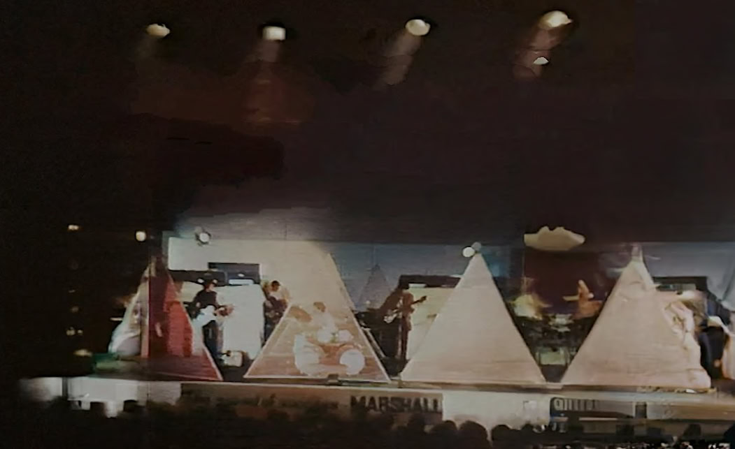 «A set of perspex, two dimensional triangles, about 5 foot high, were positioned across the Olympia stage.Each triangle had random concentric circle motifs etched into them, andthese circles picked up the light as it passed over the perspex. Introducedby John Peel, the Floyd set up amongst these shapes, enclosed within thisweird environment of floating, geometric designs. The music kicked - in,and then it hit us.