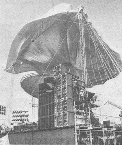 Loud VCS3 synthesizer marked the start of "On the Run” as spotlights flickered through the crowd. A giant airplane, floating magically on invisible guy wires above the throng’s head, passed the stage, smashed into the wall, and exploded into flash-powder flames with a convincing “Whoomph!"" The 10,000 fans roared their approval.