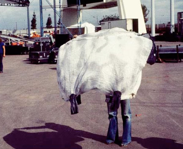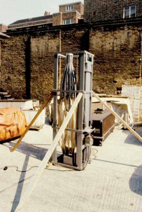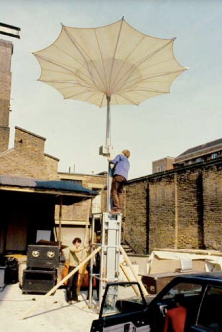 When the steelwork was completed, Pink Floyd decided to abandon the pyramid project. Fisher and Park saw It as an ideal opportunity to put the theoretical notions of transient structures to the test. They re-configured the structure as a portable staging gantry to be erected by two mobile cranes and a very small crew. They added a lightweight fabric roof and produced a series of drawings showing its possible uses. It eventually paid for itself when it was transported on two flatbed trucks to form the stage for, among others, Led Zeppelin at Knebworth, Queen at Saarbrucken and in Nuremberg. Later Britannia Row extended it in anticipation of another performance of The Wall. But It spent most of the time overgrown with nettles at Knebworth and was last seen on the edge of an airfield in Toronto, where in 1988 Pink Floyd had intended to use it in a cut-down form ».