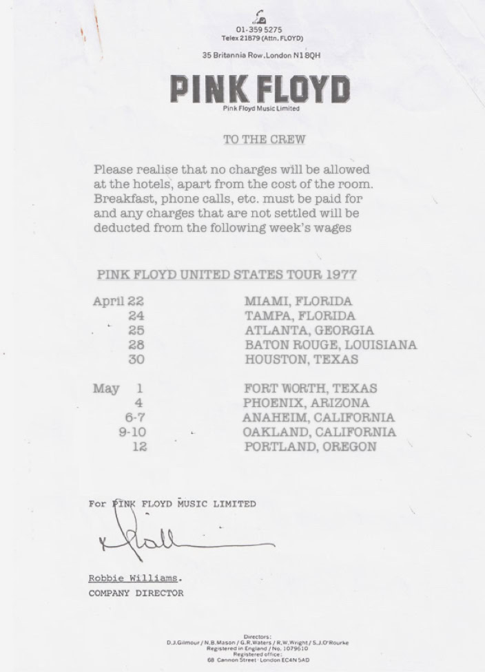 «When I was in Germany with the Floyd in 1977 on the Animals tour, everyone was a barrel of laughs but Roger. We had dinner together, the visiting guests of EMI, the management, and three of the band, but he didn’t come. I wondered why he was being so distant, especially since I’d just given the new album an enthusiastic review. It turned on that he hadn’t read it. But a few days after my return, I received the following missive, written on Lufthansa airmail paper, clearly on the same plane home as me: