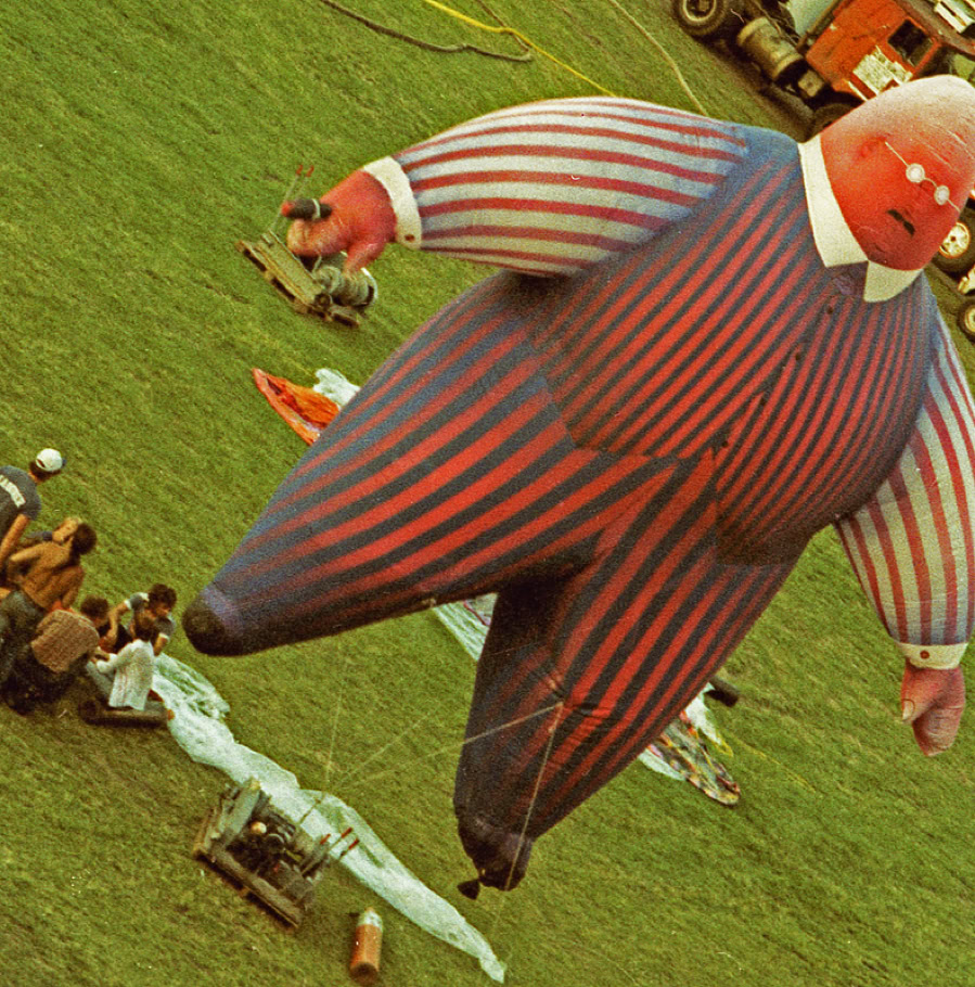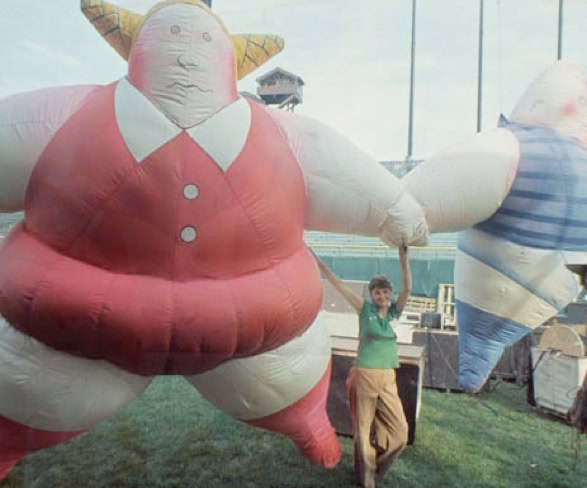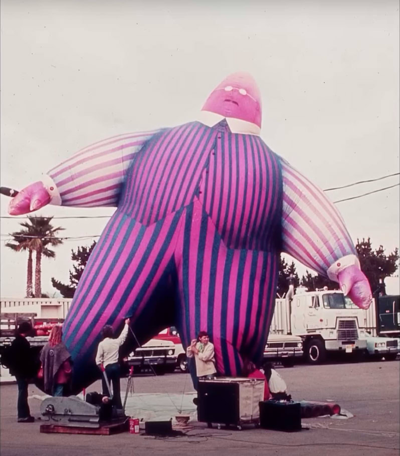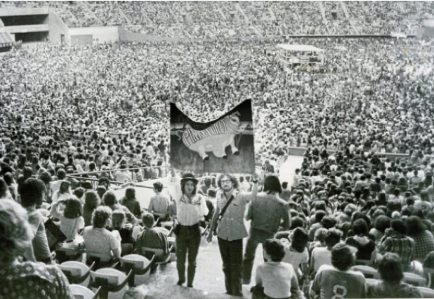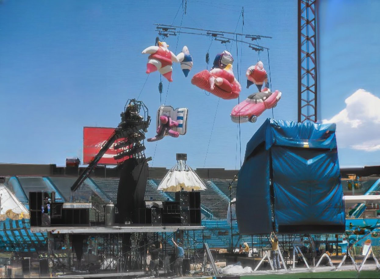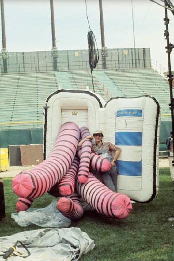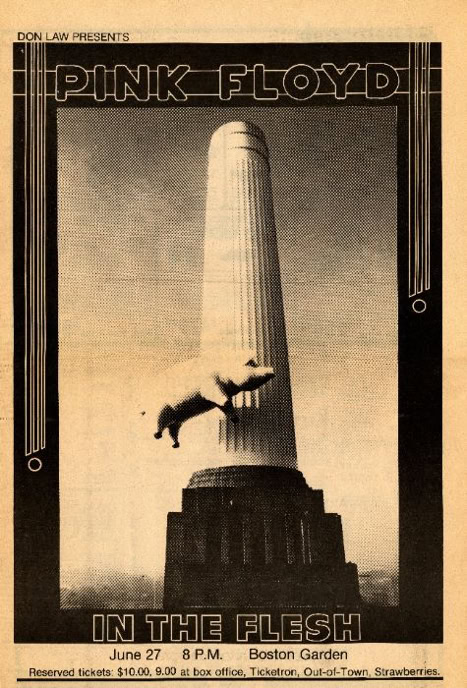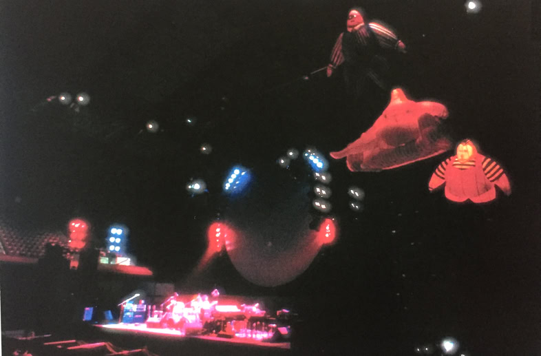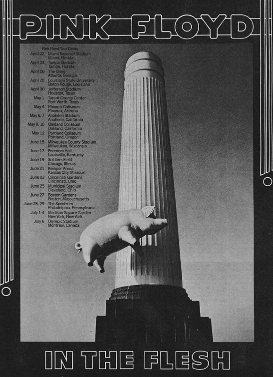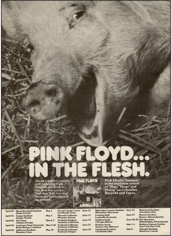 The band used spectacular visual effects to accentuate the doomsday message of their pulsating rock rhythms, displaying animations on a 25-foot screen suspended above the stage. The animations, brillant in their conception and production, drew the longest and loudest ovations of the four-hour evening. During the opening set, which consisted of a re-arrangement of the group’s most recent album, animals, inflated dolls representing a western family resplendent with their material possessions - a refrigerator and a TV – were a cynical condemnation of American society. The theme of the album is that society is dominated by pigs and dogs, and one song warns the rest of the people that «the dogs are dead, you better do as you’re told, get off of the road if you want to grow old ».