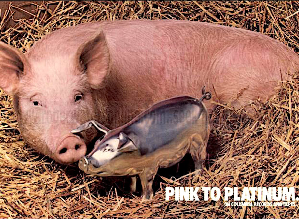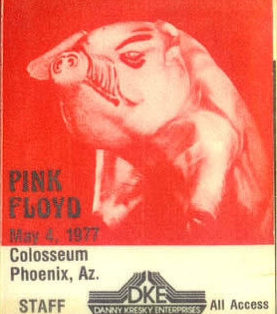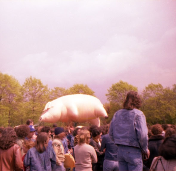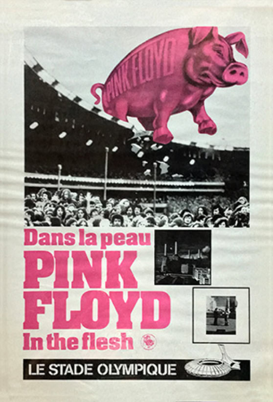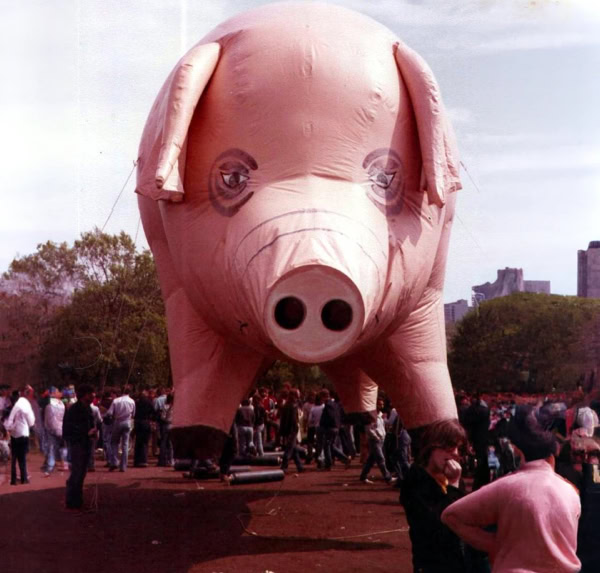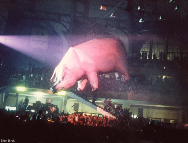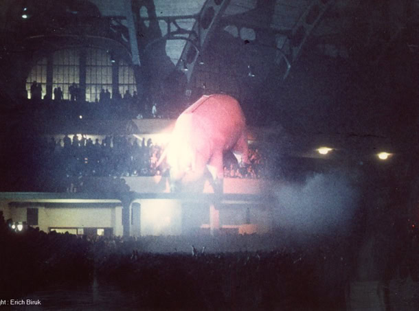 Oui, le cochon de la pochette qui s'envole soudain au beau milieu de « Pigs », traverse la salle dans les airs par un système de filins et vous regarde de ses deux gros yeux jaunes lumineux. Curieuse scène alors que cette foule applaudissant à tout rompre ce porc énorme, comme s'il s'agissait d'un de ses dieux. Il est vrai que ce cochon ainsi ovationné par les habitants de la capitale de la saucisse paraissait délicieusement bien dans le contexte. Voilà qui ne manquait pas de sel. Ailleurs, la dimension de la scène touchera plus les philosophes, sociologues et psychologues : voilà que Pinky fait adorer le plus vil des animaux domestiques, c'est ce qui s'appelle avoir de la force de persuasion. Et pendant ce temps, nous tentions de persuader Ducray qu'il n'était pas en proie à du délire : c'était bien la première grosse bébête rose tout à fait réelle qu'il voyait, vu que d'habitude elle disparaissait toujours quand il disait : « Et un verre pour le gros monsieur tout rose avec une trompe, garçon».