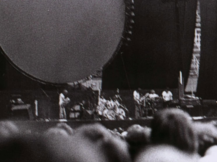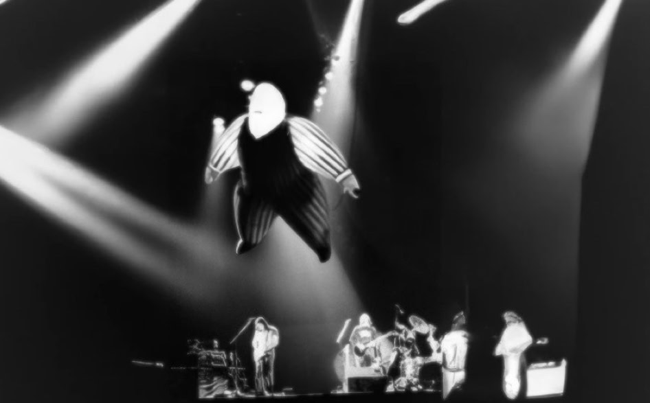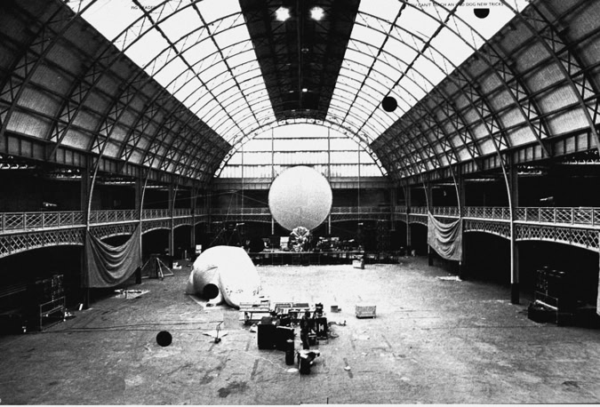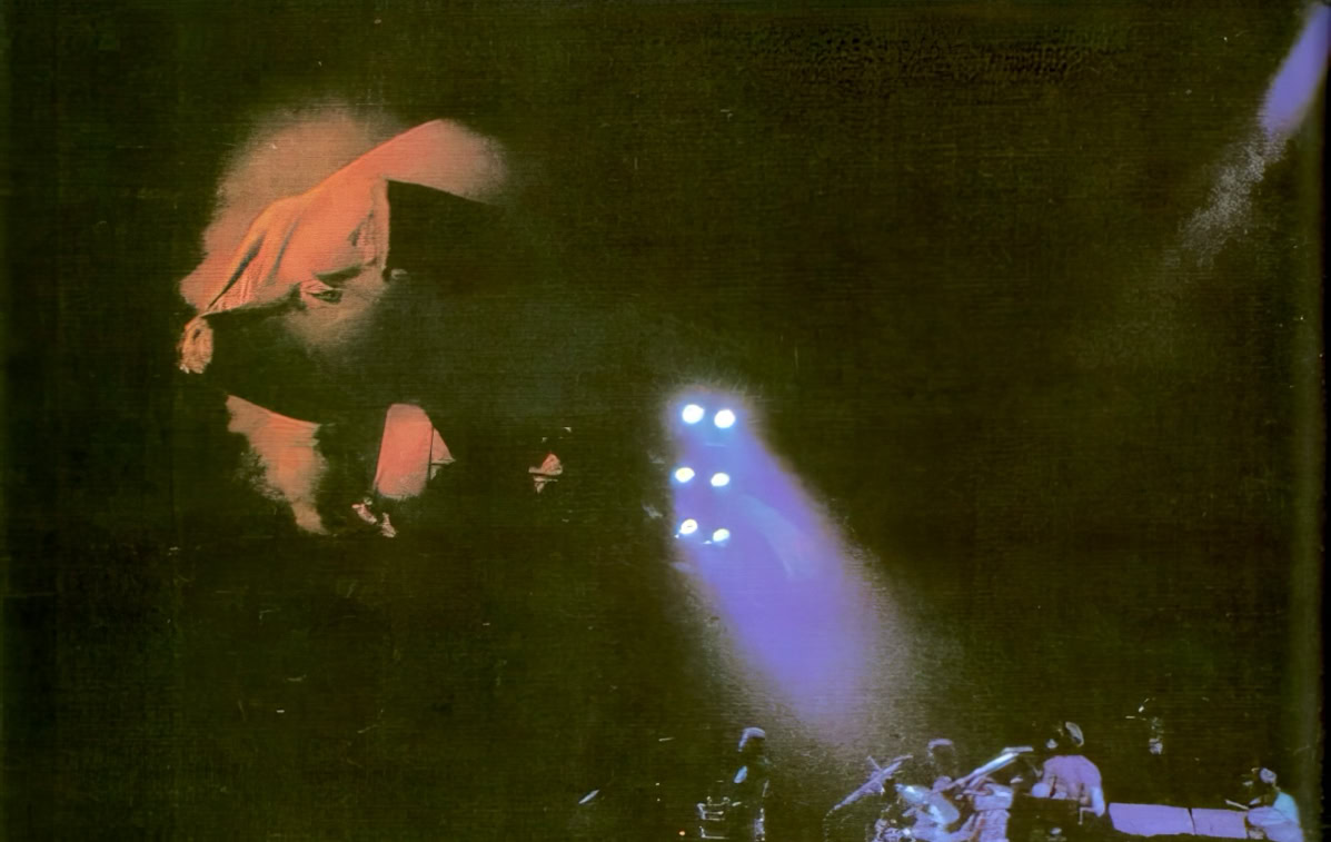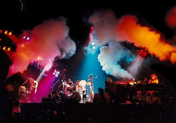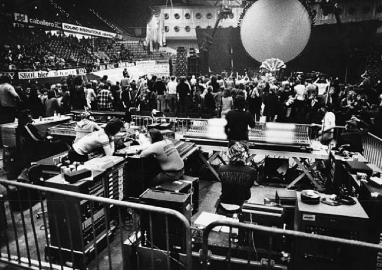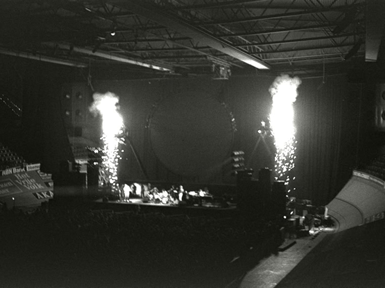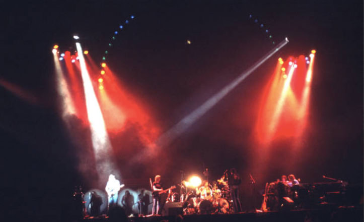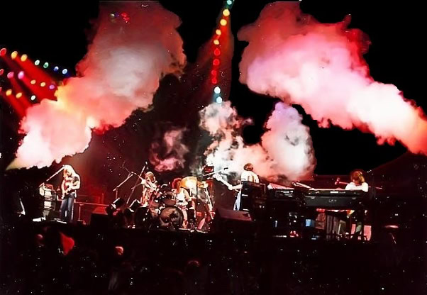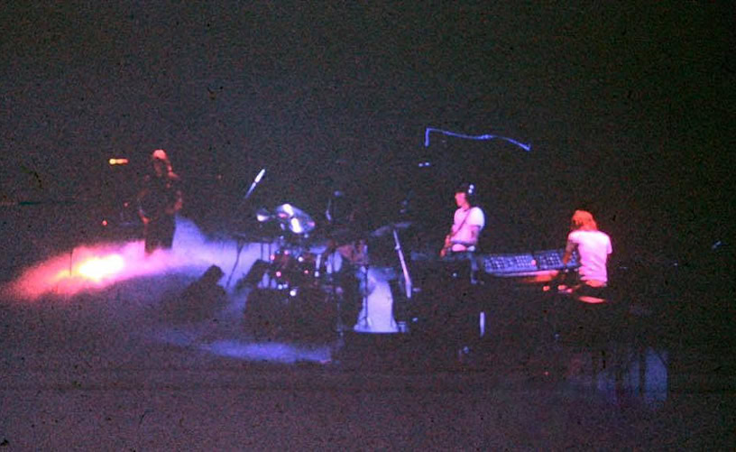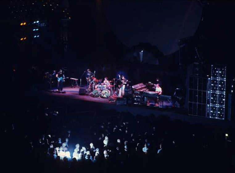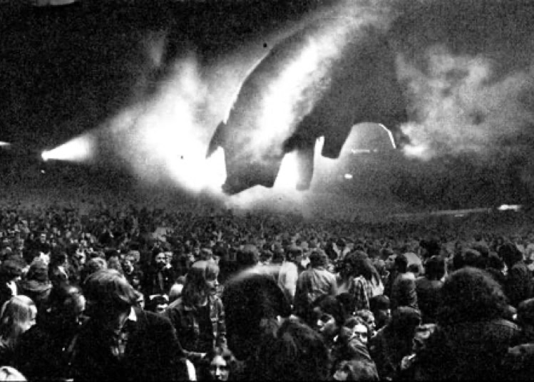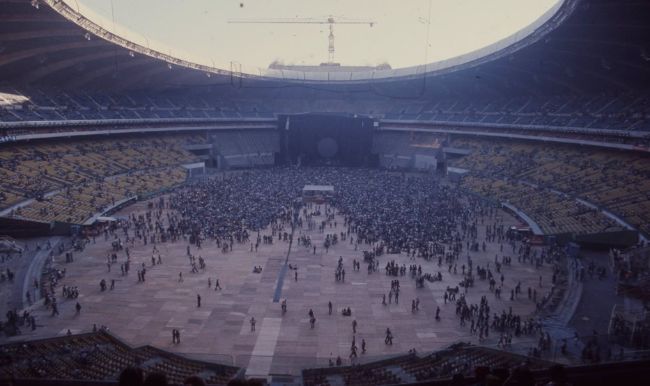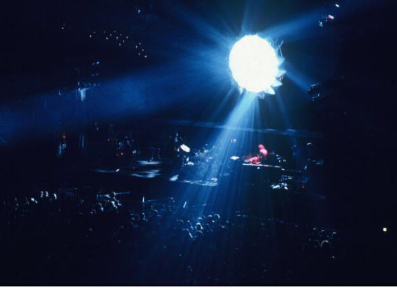 Mais il y a quelque chose en plus, qu’on ne comprend vraiment qu'en assistant à un concert. Qu’on imagine le Hallenstadion de Zurich, cette immense conque, entièrement tapissée de spectateurs. Avant le concert, on entend un bruit de mer : ressac de voix et de rires ; une légère brume de fumée bleue piano, donnant à l’imago le ton irréel d'un mirage. La» lumière s’éteint : instantanément, une grande clameur parcourt lu vaisseau, qui s’illumine de milliers de flamèches de briquet. Quand la musique vient enfin, diffusée par des dizaines de haut-parleurs, empilés de part et d’autre de la scène, au fond et sur les côtés de la salle, on est dans un autre monde. Même le plus inattendu parait soudain naturel : ces rayons de lumière qui épinglent les musiciens comme des insectes ; ces deux grues noires porteuses d'autres projecteurs, qui viennent du ciel éclairer les mains des musiciens ; cet immense cochon de baudruche gonflée qui survole la salle dans la pénombre : cet écran circulaire où des images minérales illustrent la musique... Jamais cet immense attirail de scène n’a l’air d’un gadget: Jamais les fioritures du spectacle ne paraissent vaines.