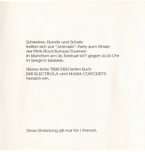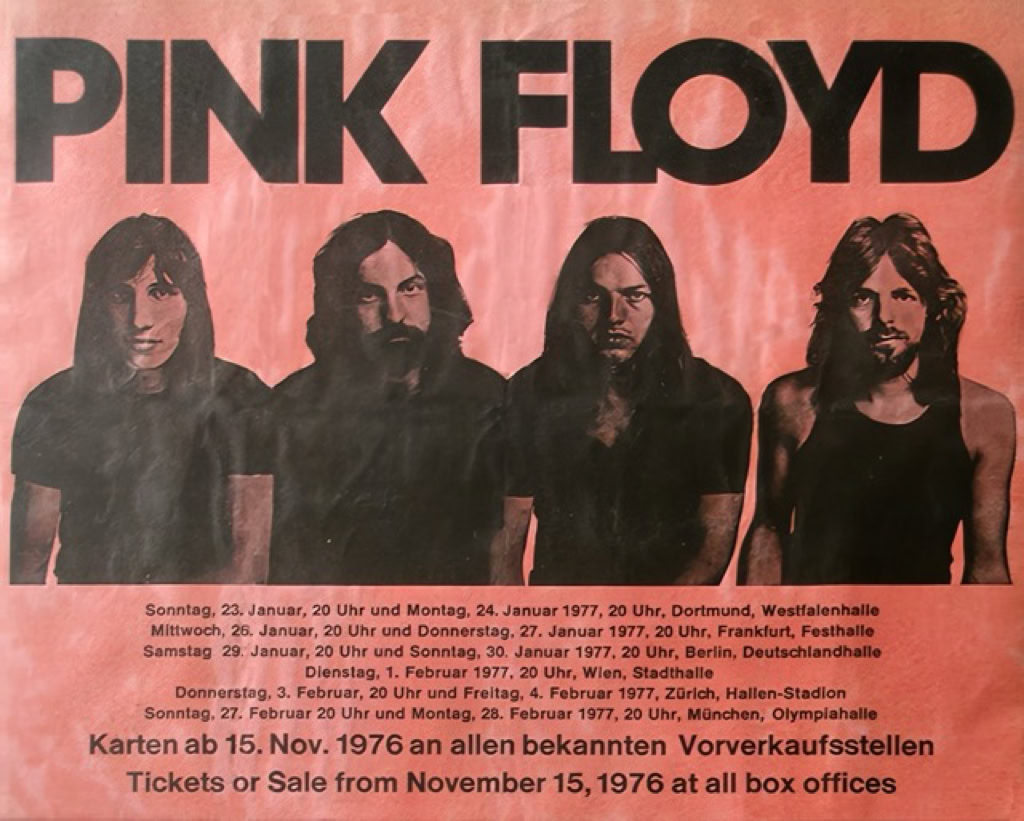 RADIO SESSION | 21 January, 1977 Nick Horne plays « Animals » as conclusion of the 6-part radio show « Your Mother wouldn’t like this » the day of the album release The same day, the crew and the material departure from London to Dover. The caravan takes the ferry between Zeebruge to Essen. The following day, the band and the crew take a flight for a soundcheck at Westfallenhallen around 3 pm and following rehearsals about 4pm.