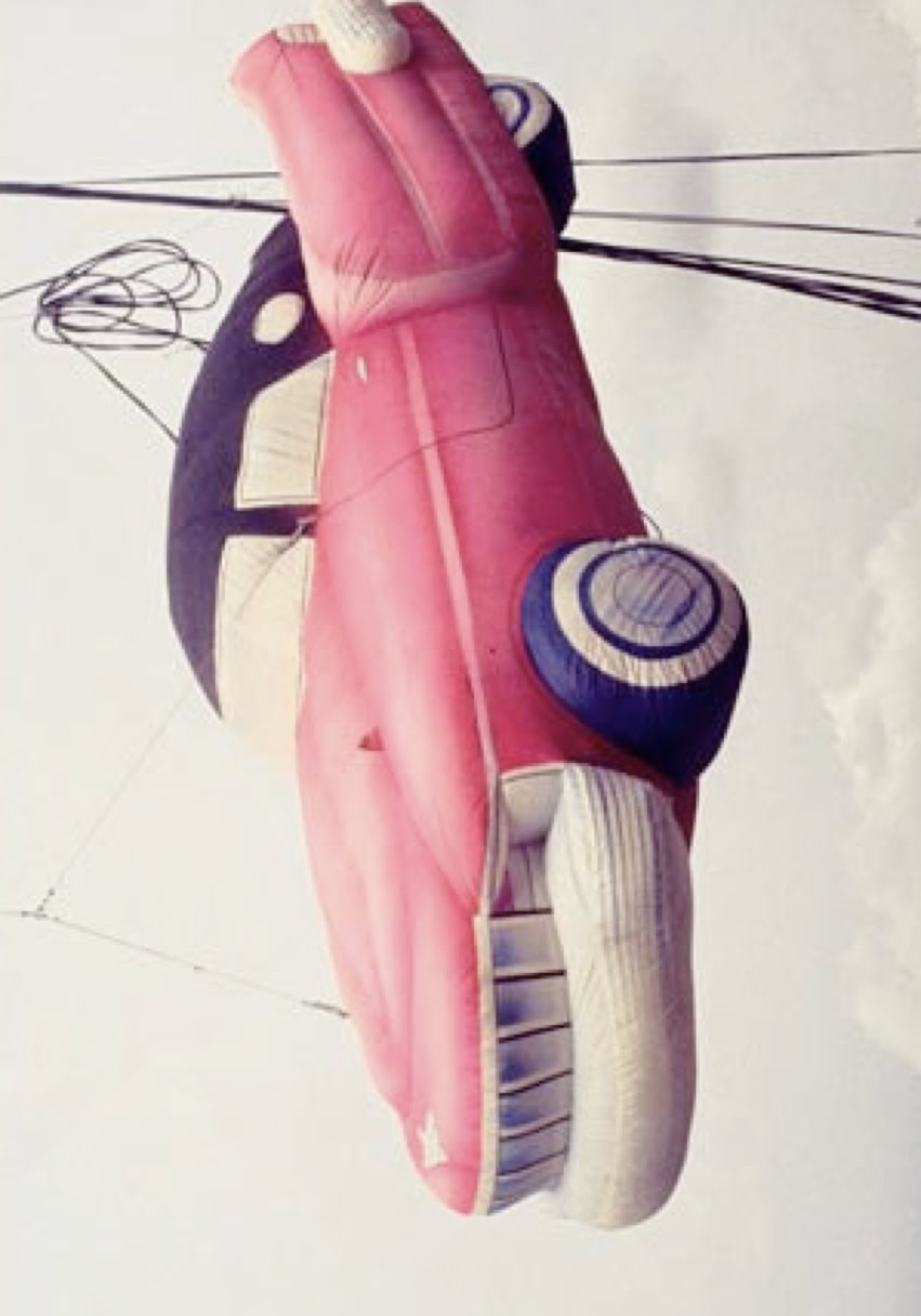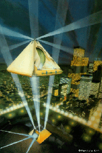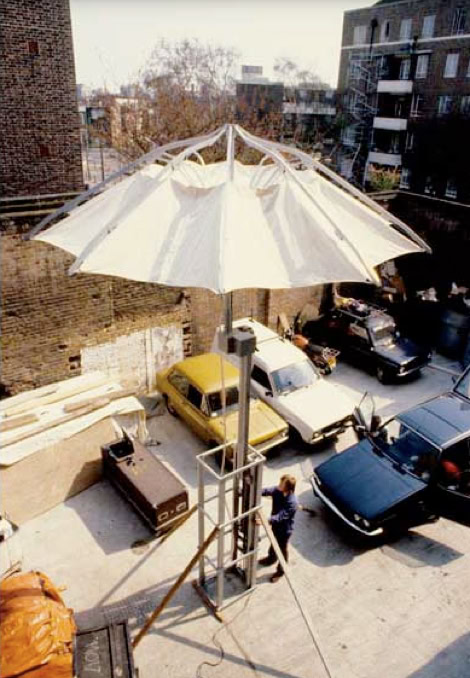Jonathan Parker: «What we did was that we created something which would work. This consisted of a base structure of a cube, which had a ring beam and four columns made from lattice girders. Inclined wires came down to make the lower part, and the upper half was an inflatable that would sit on top. And the whole thing would combine to make a great pyramid which would allow the top to float away from it. And it would be anchored at four corners so it would not move off station. And it would go up as far as it could with whatever the weather conditions were. And then it could be brought back down. In any event, it never got further than the drawings that Mark made of it »