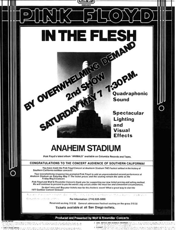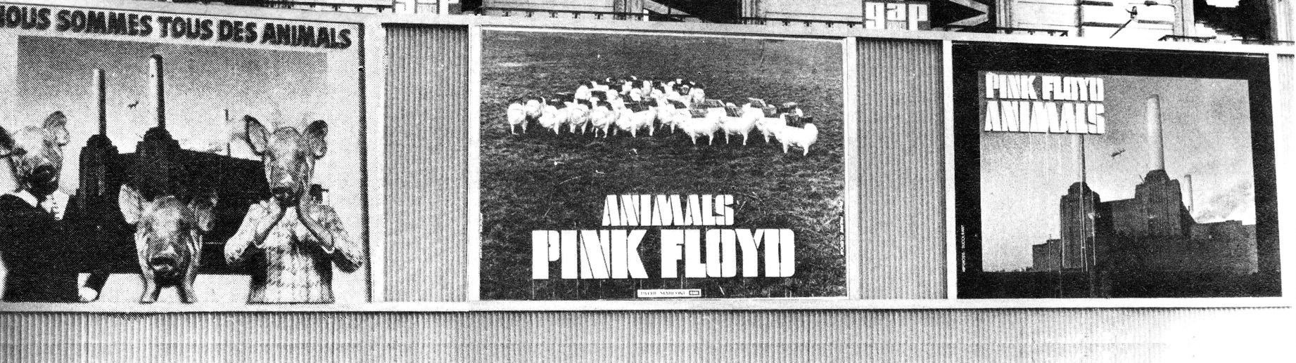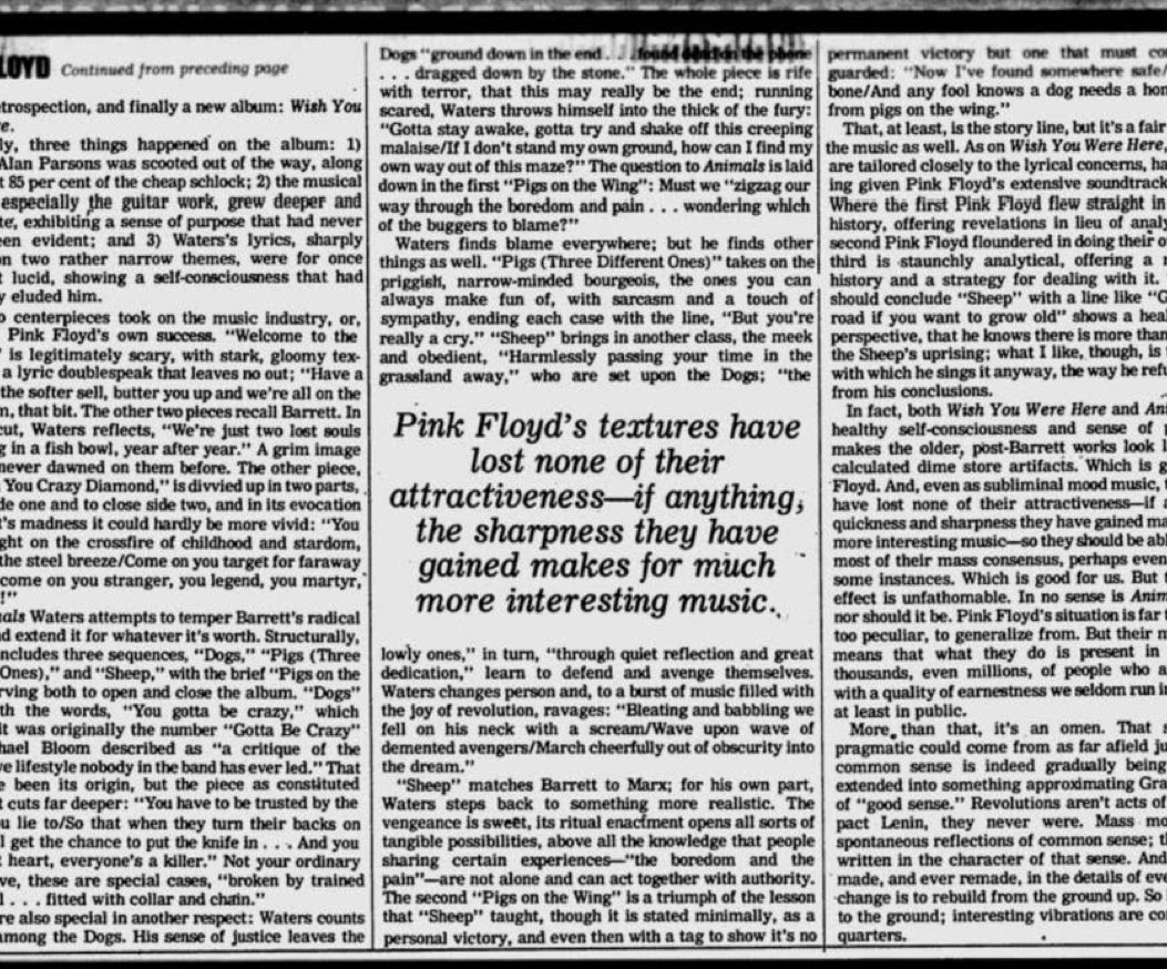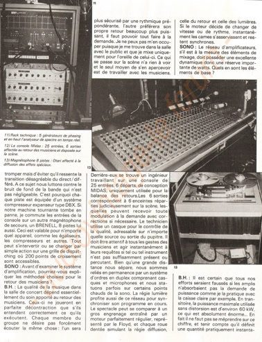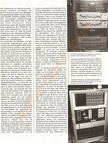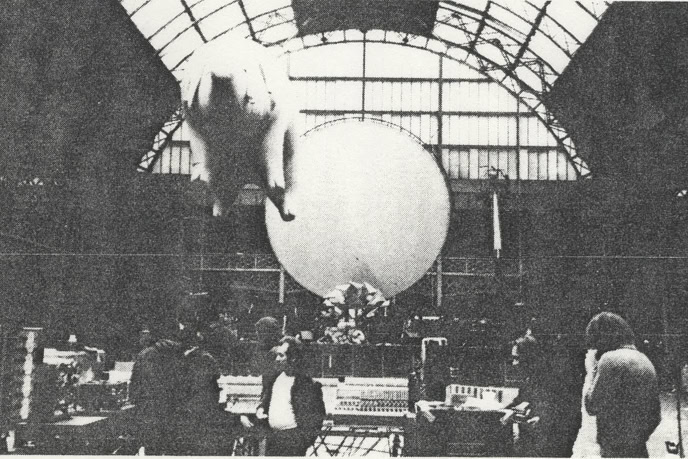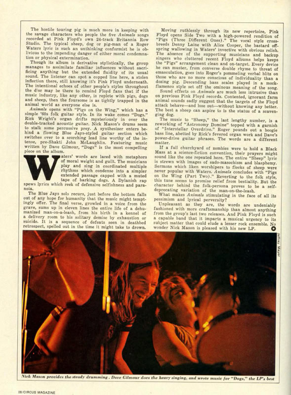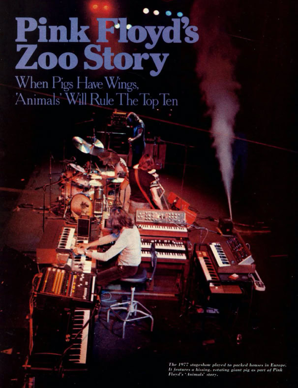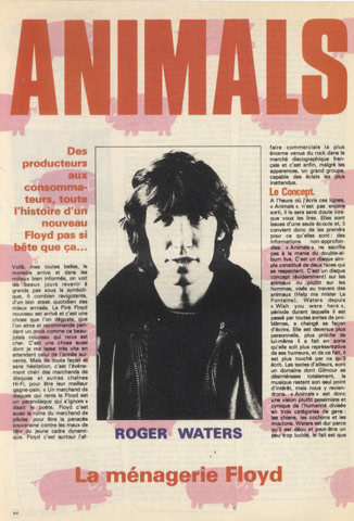 «(…) Et à vingt heures précises, un énorme grondement métallique monte du fond de la salle, la traverse en sifflant et, en atteignant la scène, semble souffler toutes les lumières : c'est parti. Pour des perfectionnistes comme les Pinkies, l'heure c'est l'heure. Point n'est besoin d'entretenir l'hystérie en. jouant sur le retard et l'énervement croissant, comme le font les Stones ou les Who. Le concert se déroule en deux parties séparées par un entracte. La première est consacrée au nouvel album, « Animals », qui est aménagé de façon à durer une heure, de même que pour « Wish you were here » qui occupe la seconde partie et qui a été également allongé pour ne pas voler les gens ni créer de problèmes de répertoire au groupe. Alors que « Wish you were here » est interprété intégralement dans l'ordre de l'album, « Animals » a été aménagé : le concert commence par « Sheep » et ses bêlements, puis un premier intermède acoustique avec « Pigs on the wing », joué par Waters seul avec un petit accompagnement d'orgue assure la transition avec les aboiements de « Dogs » ; ensuite vient la seconde partie de « Pigs on the wing », plus étoffée, avant « Pigs », le morceau de bravoure qui clot cette première partie. Pendant tout ce temps, l'écran reste vide. L'éclairage seul assure le spectacle. Sur ce point, les Floyd ont innové, et avec beaucoup de bonheur. Partant de chaque côté de la scène, deux immenses bras télescopiques portant chacun un nid de projecteurs, déplacent l'éclairage à volonté au-dessus de la tête des Pinkies, conférant ainsi une souplesse inédite à l'emploi des spots. Et il est assez fascinant de voir ces deux grands tentacules sombres se mouvoir derrière la scène, comme si quelque monstre de métal tissait dans l'ombre quelque toile maléfique. La première fois que ces engins entrent en action, qu'on discerne vaguement ces masses sombres s'élevant dans l'air comme propulsés par le faisceau des spots, on croit voir un de ces engins fous qui encombrent le cosmos féerique du dessinateur Chris Foss. Quelques effets de projecteurs plus classiques sont aussi bienvenus, comme le ballet de deux faisceaux rouges sur les cintres tandis que la musique plane un instant, qui suggère une recherche, fait attendre un événement, jusqu'à ce qu'enfin le doigt de sang vienne dégouliner sur Rick Wright qui entame alors un solo de synthé. Mais la sensation de cette première partie est assurément le tour du cochon.