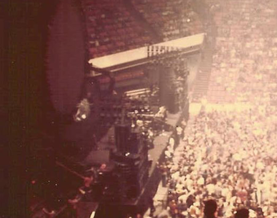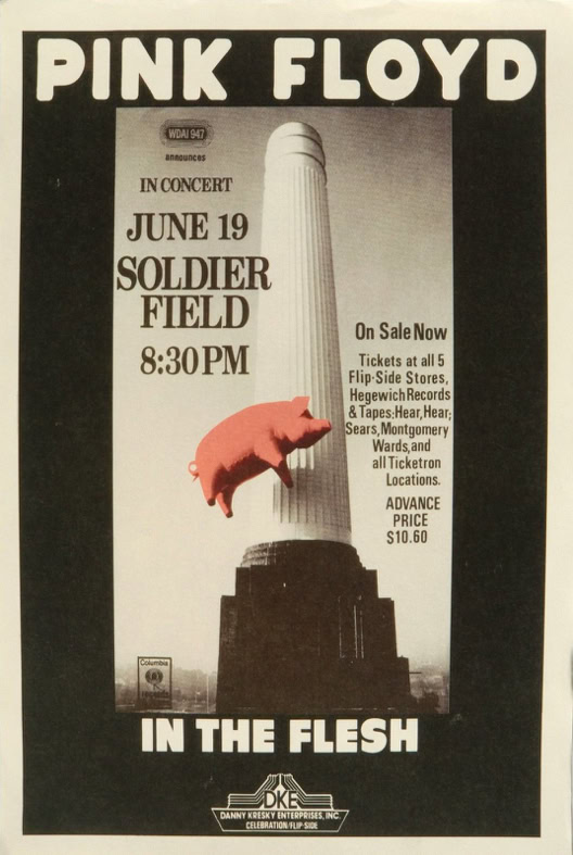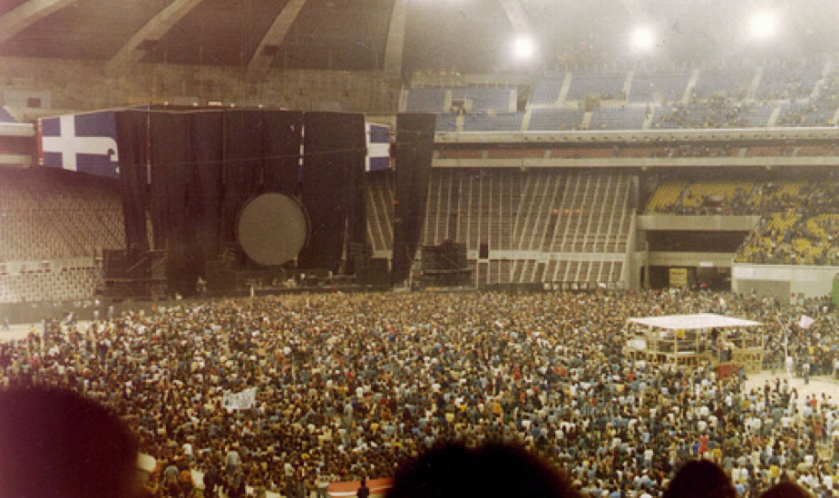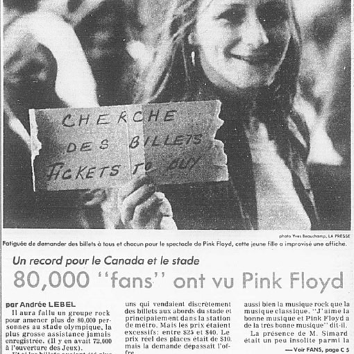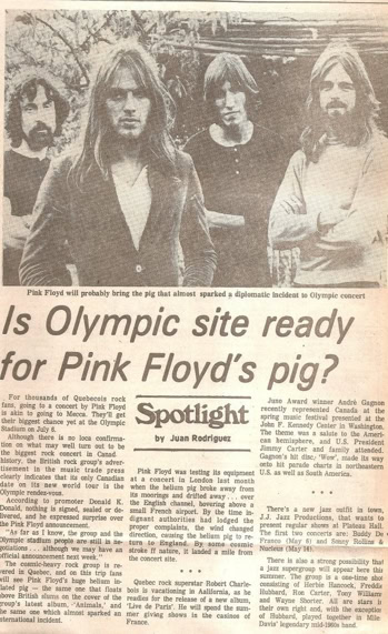 «Pink Floyd’s concert at the Big O in 1977 was hyped as the largest ever held in Montreal : 80,000 fans flocked to witness the Animals Tour, with its giant pig floating overhead in the venue. The Gazette went gangbusters on coverage, dispatching me to Philadelphia to check them out the previous week, and sending me to stake out the Bonaventure Hotel for Floyd sightings the day before the show. (Luckily, I nabbed Nick Mason in the coffee shop.) This Olympian gig meant filing a story by phone at 9:30 p.m. for the early edition and, two hours later, filing end-of-concert adds and whatever else I had left.