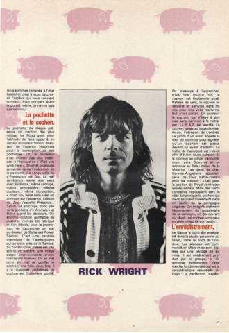 « Animals was in a way, the beginning of the departure of me from the Floyd, because “Animals” was Roger's concept, if you like, and I didn't actually write anything on Animals. So I was just like Nick, playing the music».