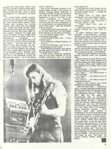 « The only time I've ever seen Pink Floyd live was the encore in Montreal stadium in 1977 — the last gig of the Animals tour, the one that Roger spat on someone at, I think. I was so pissed off about something, and I can't even remember what it was, that I refused to play the encore, and went out to the mixing desk to watch whatever encore it was, with Snowy playing [my] parts. That was the only moment I saw a tiny bit »