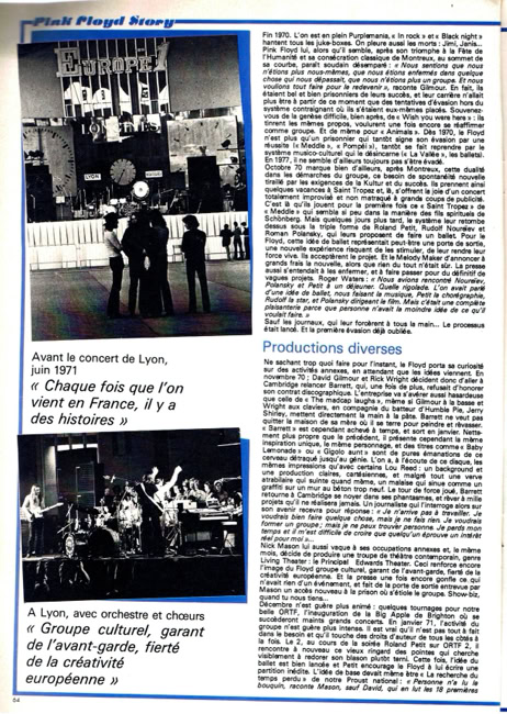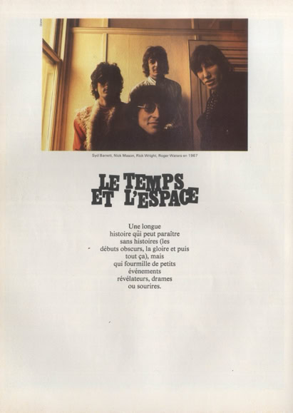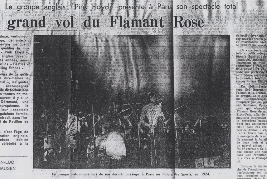 «Comment expliquer le succès de Pink Floyd ? A Zurich, ce groupe de jazz-rock anglais jouait jeudi et vendredi à guichets fermés — tous les billets avaient été vendus en quelques jours ; avant même l’an-nonce publique des concerts — dans le Hallenstadion plein à craquer : 22 000 spectateurs en deux soirées. Chacun de ses disques est salué comme un événement, avant meme sa parution, et se vend par centaines de milliers. Et c'est probablement le seul groupe contemporain qui réconcilie les générations : enfants, adolescents, parents partagent souvent la meme passion pour cette musique étrange qui, en quelques années, est entrée dans nos habitudes.