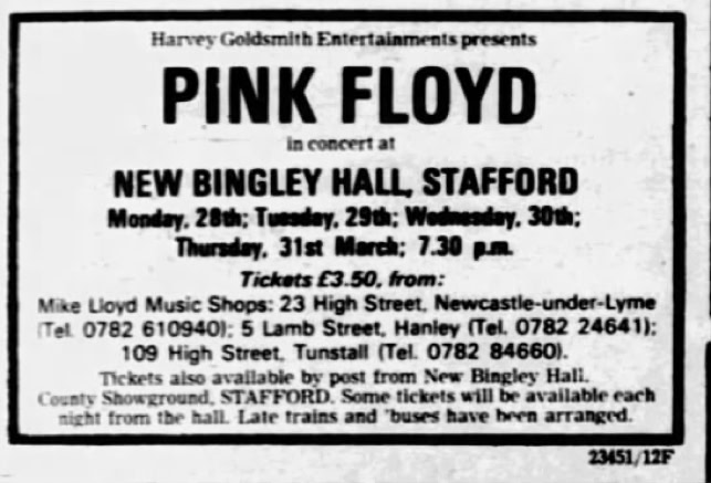 CONCERT DATE | 23 January 1977 Westfalenhalle, Dortmund, Germany First show of «In the Flesh» tour. The soundcheck was scheduled at 3.00 pm. The doors opened at 6.00 pm. The show began at 8.00 pm.