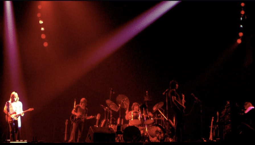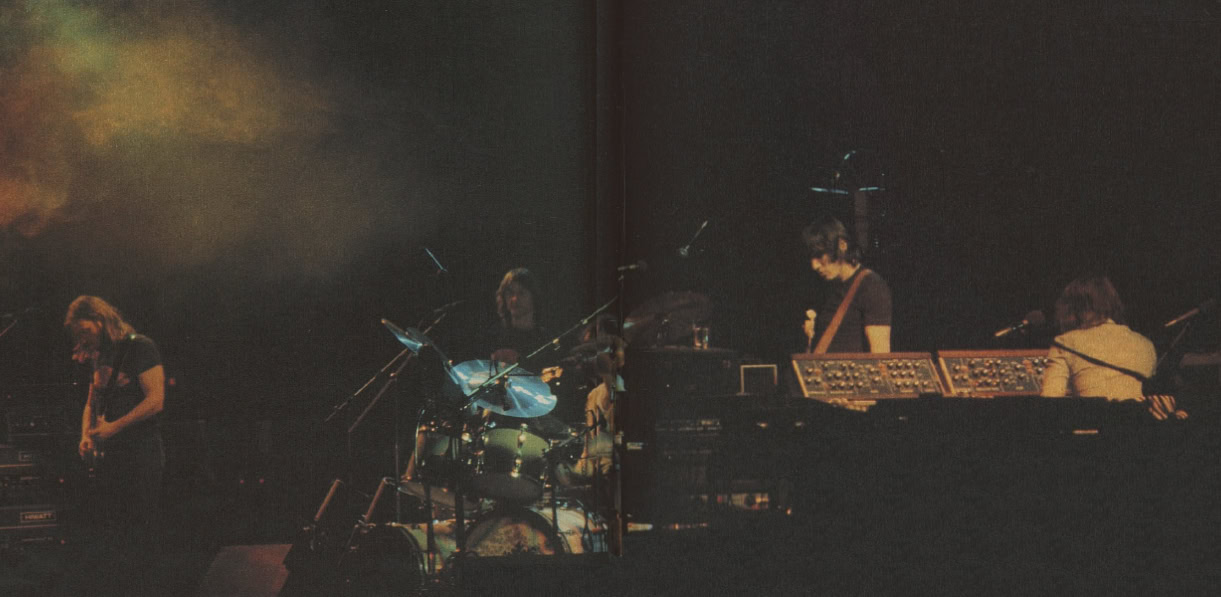 But suddenly Pink Floyd strode out for a totally unprecedented third encore, jamming some blues for 15 more minutes while the roadies cleared the stage. As the equipment slowly disappeared from stage, the band quietly disassembled itself, until there was just the bass and the drummer with his solitary snare drum. Both were finally carried from the stage and the concert came to final close.
