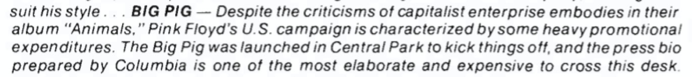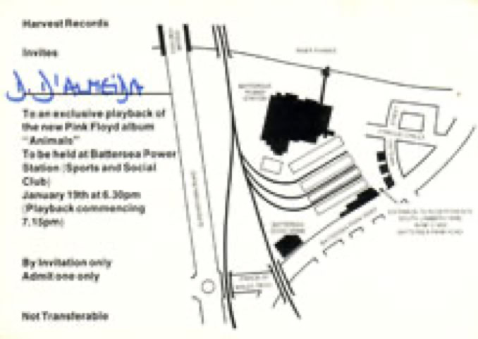 Then last week the world's press and his wife were invited to Battersea Power Station for a preview. (Why Battersea? Well, friends, its tall chimneys, plus a large inflatable pig will feature on the album's cover). The playback started and the furtive scribes commenced note-taking. «We can't have this», sneered the man from Harvest. «We don't want them to review it on just one listen. Go and tell everyone to desist at once».