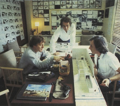 Director Gerald Scarfe, cartoonist Alan Parker and production designer Brian Morris at Pinewood Studios office. Photographies by David Appleby.