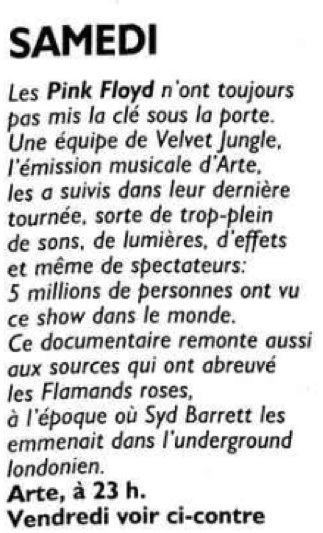 A TV program dedicated to the life of a guest through the testimony of his friends and family. Today's guest is John Peel, who reviews his career with testimonials from various artists and talks about his relationship with the Floyd with a short extract from Money filmed in Venice in 1989.